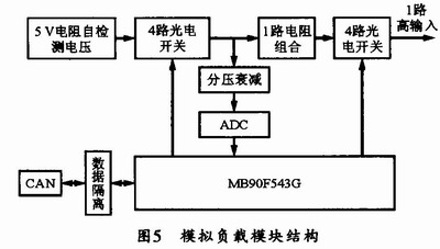 在对LCU进行测试时,还需要测试其高输出在带负载情况下的工作状况,所以,本设计还给出了模拟负载单元,以模仿电力机车上的负载。每块LCU控制板对应一组可选负载(共需8组),每组负载有4种可选阻值(根据SS4G电力机车实际情况选330欧、220欧、110欧和55欧);另外还需具有负载自检功能,应可判定负载电阻是否短路、断路或阻值异常等情况。其工作原理是在正常工作时,由单片机通过4路光电开关对电阻阻值进行选择,以作为LCU高输出的负载。负载自检是通过单片机选择要检测的电阻阻值,同时自检电源的导通开关打开,以对要检测的电阻进行通电,然后对电阻的电压进行AD转换,并反馈给单片机以供检测是否正常。其模拟负载模块的结构框图如图5所示。