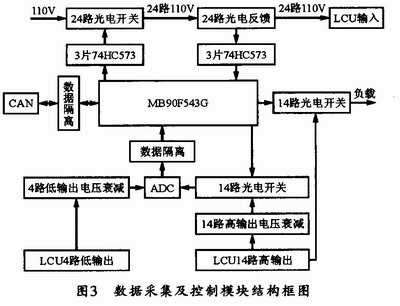 数据采集及控制模块的具体工作原理是:上位机通过通信模块的CAN总线向本模块发送相关控制命令,然后单片机根据命令来控制24路光电开关的接通或关闭。为LCU板提供24路输入逻辑控制信号(高电平为70~135 VDC,低电平为O V)。为了确保24路逻辑控制信号的正确,本设计使用24路光电反馈电路将其转化成TTL电平信号,再送回单片机进行判断。每块LCU控制板的输出有14路高输出" title="高输出">高输出和4路低输出,所以,对其输出信号的采集也分为14路高输出采集和4路低输出采集,它们共用一个AD转换器,并采用分时复用的方式来对各个输出进行AD转换。另外,在对LCU的高输出进行检测时,还需检测其在带载情况下的输出电压。