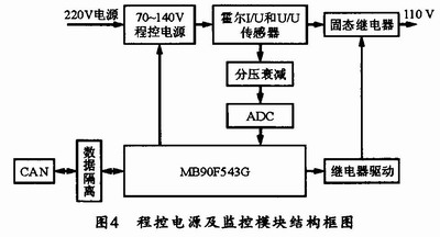 程控电源及监控模块主要是为LCU测试台提供工作电源,并实时对电源进行监控。本程控电源具有四种不同的输出电压(DC70 V、DC75 V、DCll0 V和DCl37 V),可以测试LCU在不同电压下的工作状况。为了保证测试台设备和被测LCU的安全,此模块中设计有过流过压报警及保护功能。当工控机通过通信模块的CAN总线向程控电源及监控模块发出调压命令时,可由单片机控制程控电源进行输出电压调节。在正常工作状况,可通过霍尔传感器对输出电压电流进行实时采样,以监视电源的工作状况。当发现电压或电流不正常时,可延时100~500μs(防止电流毛刺)再对电压电流进行检测,若仍不正常,则立刻关闭固态继电器,同时向上位机发送电源异常数据。图4所示是程控电源及监控模块结构图。