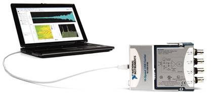图1:NI软硬件帮助笔记本电脑轻松捕获自动化测量。利用一个NI的四通道模拟输入模块,通过一个USB端口连接到PC。