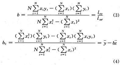 用最小二乘法们来估计参数β0,β。设b0,b分别是参数β0,β的最小二乘估计,于是得到一元线性回归的回归方程: