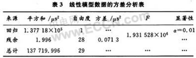 以上求得了回归方程,但是该方程是否基本上符合y与x之间的客观规律,是否符合晶振频率误差变化的实际特点,还需要对回归方程做进一步的分析。在回归分析法中,通常采用方差分析法们对回归方程的显著性进行检验,其实质是将N个测量值的影响从数量上区分开,然后用F检验法对所求回归方程进行显著性检验。