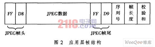 应用层成帧模块将图像帧封装成应用层帧,并添加序列号、帧长度与校验和到帧尾(见图2),用来在接收和显示端检测不同类型的错误。摄像头输出的JPEG 图像自带帧头与帧尾标识,帧头为0xFFD8,帧尾为0xFFD9。