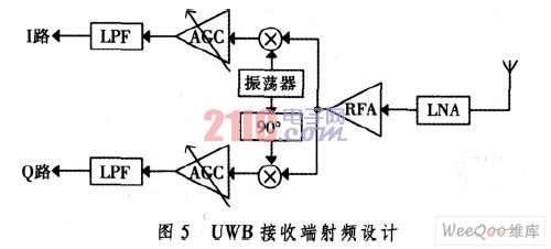 UWB 接收端承担着对抗多径衰落的重要任务,因此其设计复杂度比发送端高很多。UWB 接收端也包括射频接收与基带接收两部分。在射频接收部分(见图5),使用零中频正交解调的方式处理射频信号。射频信号经低噪放大器(LNA)与射频放大器(RFA)实现低噪声放大,再经正交混频,产生I,Q 信号,供基带载波恢复使用。自动增益控制放大器(AGC) 将混频后的信号幅度调整至适合ADC满幅工作的状态,低通滤波器(LPF)滤除高频分量后,信号被送至基带接收部分处理。