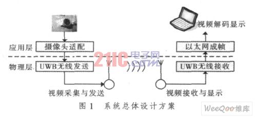 系统总体设计方案如图1 所示。在视频采集与发送端,使用小型摄像头,配合摄像头适配,完成视频采集。采集到的视频信号经过UWB 基带和射频处理, 经由天线发送。在视频接收与显示端,天线接收到的无线信号经过UWB 射频和基带接收模块处理以及以太网成帧后发往PC,由运行在PC 上的视频解码与播放软件显示。