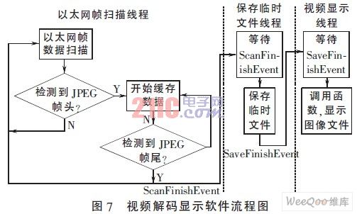 由于OpenCV 仅支持文件形式的图像解码与播放,所以需要将应用层帧中的JPEG 数据保存为临时文件,再进行播放。由于以太网帧解析、临时文件保存和图像显示均较为耗时,因此为了避免WinPcap 软件核心缓存的溢出,使用了多线程的处理办法。视频解码显示软件流程图如图7 所示。
