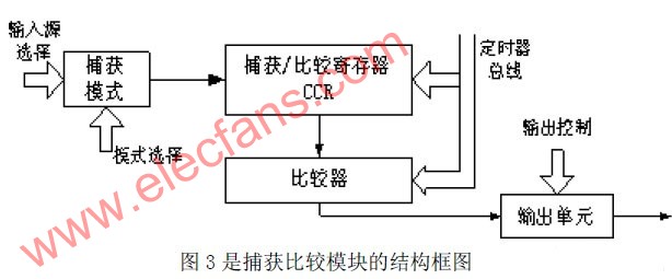 图3是捕获比较模块的结构框图 [5]。捕获比较模块用于捕获应用事件的发生时间,或产生定时间隔。利用Timer_Ad定时器的捕获功能,将CCTL1中的模式位CAP置位,并选定任意跳变的脉冲触发模式,当被测的红外波形产生上升沿或下降沿时,定时器计数值将被复制到捕获寄存器CCR1中。相邻两次跳变时所记录的定时器计数值之差就是高电平或低电平的持续时间。将每个时间值保存在FLASH中,就是将红外编码波形完整的记录下来。由于是波形的复制,可以避免由于厂家不同,红外遥控器发出的红外编码信号不统一而带来的麻烦。由于每发生一次捕获,捕获/比较模块寄存器将产生中断,因此程序能方便的判断红外波形是否结束。另外,捕获/比较模块中的输出单元可根据定时器计数到CCRx和CCR0时,输出PWM波形。