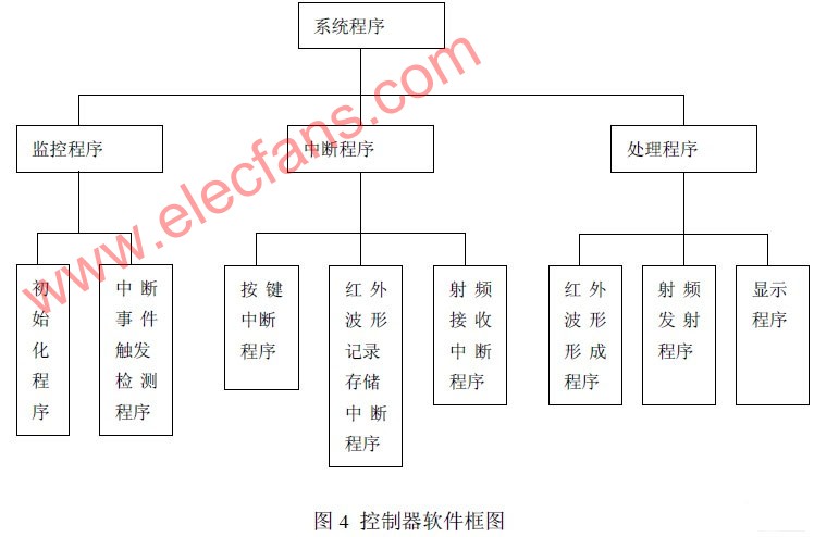 系统软件设计主要包括监控程序、中断程序以及数据处理程序等。流程图见图4。监控程序 主要完成 P1 P2口各位的输入、输出引脚定义,中断设置,定时器捕获模式设定等系统初始化,等初始化程序结束后,设定 MSP430F413工作在低功耗模式LPM4, 使 CPU处于休眠状态,其能耗最低(0.1μA)。由于P1 、P2口具有中断功能,能够实时的捕捉触发事件,P2.1和P2.2口线连接红外学习开关,P2.3连接复位开关。P1.0和 P1.1口线连接 RF接收模块,P1.2线则接收来自红外一体化接收头的信号,P1.3口线发射红外信号,当其中任何一个引脚收到跳变信号时,就触发一个中断事件将系统从休眠中唤醒,这样使得系统的用电大大的节约下来。
