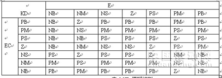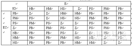 本文采用二维模糊控制系统,模糊推理输入模糊语言变量为偏差E和偏差变化率EC模糊域为[-3 3],输出为PID的三个变化增量 、 、 ,将输入模糊语言变量E .EC和输出模糊语言变量 的语言值选为都选为7个,即{负大(NB),负中(NM),负小(NS),零(Z),正小(PS),正中(PM),正大(PB)}。