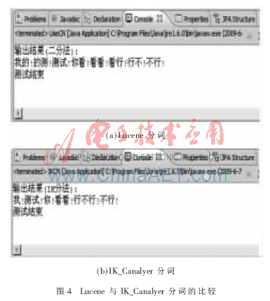 为了改进Lucene的中文分词的缺陷,MYSearch全文搜索引擎采用了IK_Canalyzer中文分析器。IK_Canalyzer中文分析器实现了以词典为基础的正反向全切分和一级正反向最大匹配切分两种方法。IK_Canalyzer中文分析器是第三方实现的分析器,继承自Lucene的Analyzer类。图4(a)和图4(b)分别为采用Lucene与IK_Canalyer分词的显示结果,可明显看出后者优于前者。