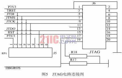 接收机中设计了两种通信接口:一种是JTAG调试接口,连接JTAG仿真器进行开发调试,下载用户程序;另一种是RS232通信串口,用于与主机通信。其中JTAG调试电路连接如图5所示。