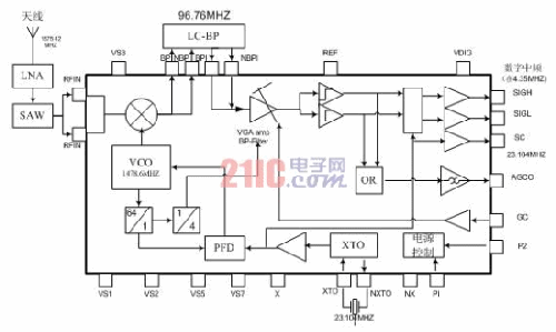 ATR0600通过外部的天线接收1575.42MHz的L1 GPS信号,经过低噪声放大器LNA进行第1级滤波、放大后,被外部SAW滤波器进行镜像抑制和对1800MHz GSM频带信号进行隔离。该信号与基准频率为23.104 MHz的本振信号进行混频,混频器将GPS信号下变频到97.76MHz中频。混频后,该信号经过LC带通滤波器和可变益放大器(VGA),与片上集成的中频带通滤波器组合,完成对GSM干扰信号的滤波。VGA输出驱动集成的1.5bitA/D转换器,将中频信号转化成4.35MHz的数字中频信号。
