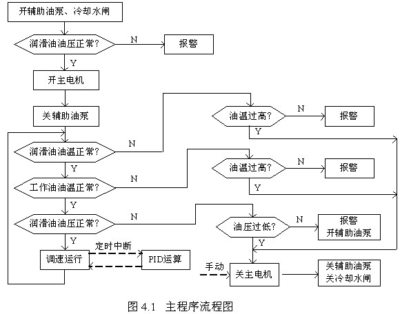 为了保证液力偶合器正常工作,控制系统必须满足严格的的启动、运行和停止条件。既开机顺序为先启动辅助润滑油泵、开冷却水闸,再启动主电机;停机顺序为先停主电机,再停润滑油泵、关闭冷却水闸;运行工作条件为勺管调速构控制功能正常、油温和油压监测系统正常等[3]。 系统主程序流程如图4.1所示。