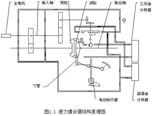 为适应机组工况的变化要求,在电动机转速恒定的情况下,调节勺管的开度,可改变偶合器工作腔里的充液量,不同的充液量可以得到不同的输出特性,因此,通过连续改变充液量既可实现输出轴的无级调速。