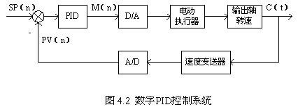 输出轴转速的PID闭环控制系统如图4.2所示,将上式数字化,写成离散形式的PID方程,则程序中实际的PID算式如下式所示: