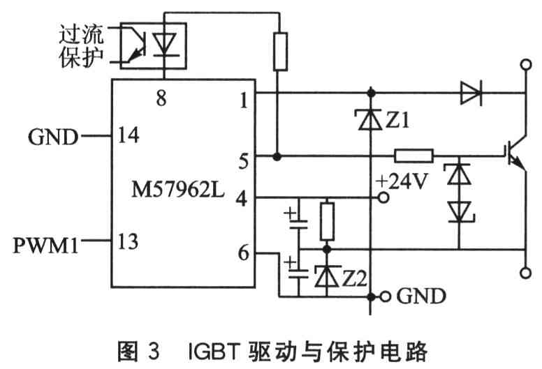 图3为驱动电路原理。本系统逆变电路功率器件采用IGBT芯片,因此驱动电路选用4片三菱公司生产的驱动模块M57962L。该驱动模块为混合集成电路,将IGBT的驱动和过流保护集于一体。图3中M57962L的13脚接DSP的PWMl(其他3片M57962L分别接PWM2、PWM3、PWM4),14脚接地,1、6脚分别接电源。另外,M57962L采用的是低电压驱动,即只有13脚输入负电位时才能驱动M57962L。这样做的优点在于防止出现干扰,当出现干扰波形时,采用低电平驱动的M57962L不能驱动。另外在关断过程中,如果电压变化过大,则会产生擎住现象,使IGBT失控,引起上下桥臂直通,因此,采用RC缓冲电路来抑制过电压和电压变化率du/dt。