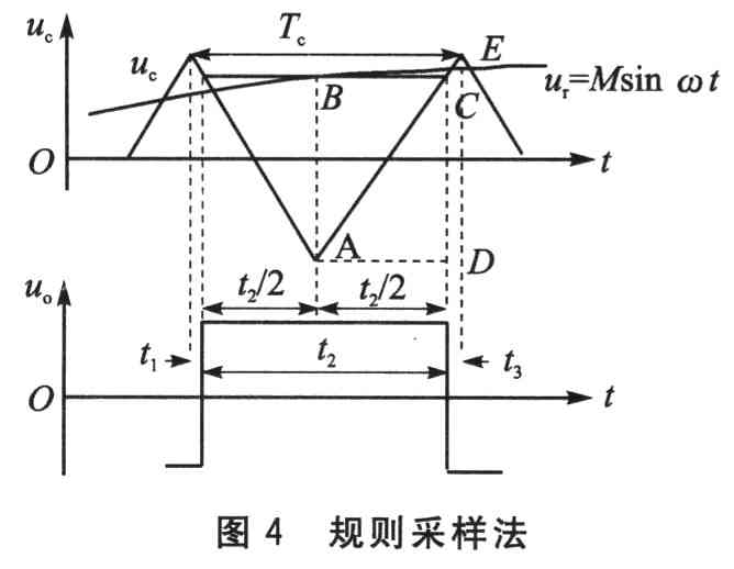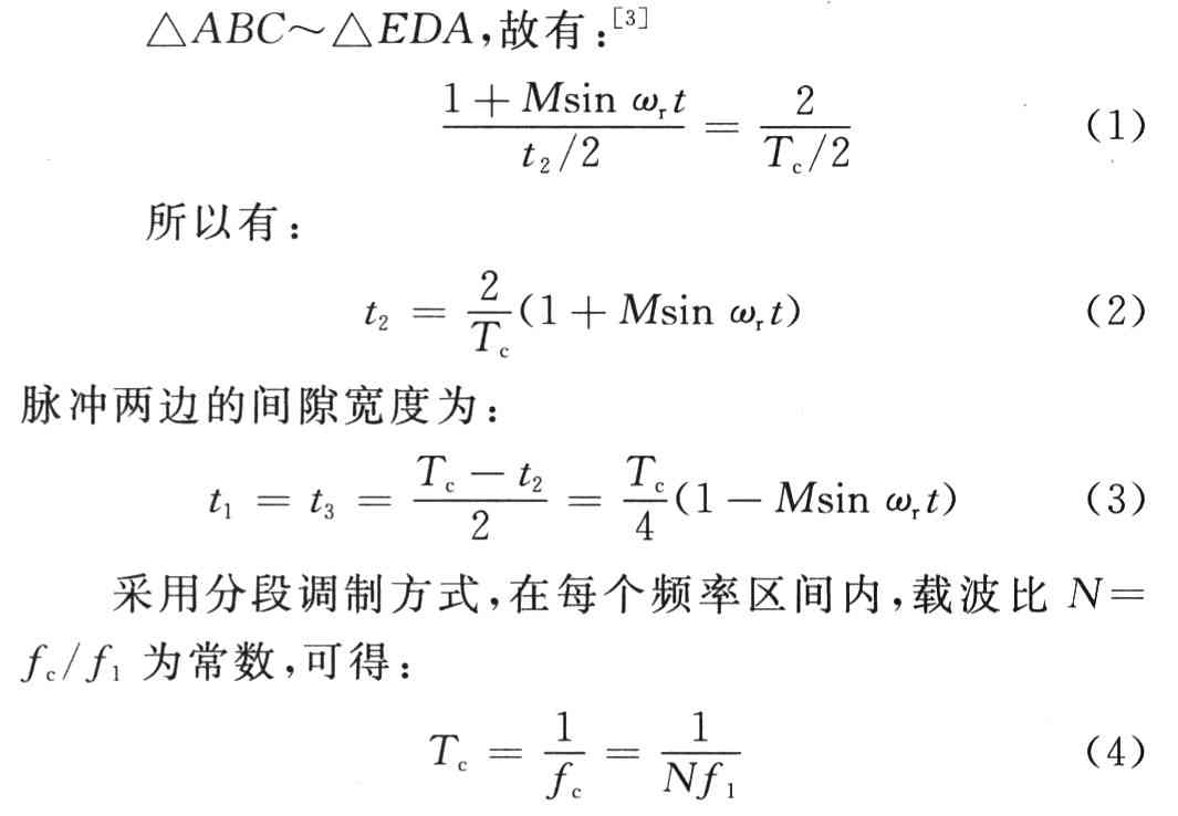 系统逆变器部分采用SPWM规则采样算法,其基本思想是使输出的脉冲按正弦规律变化,这样降低输出电压中的谐波分量,使输出电压更接近于正弦波。为了便于数字实现,用规则采样法生成SPWM脉冲序列,其原理如图4所示。因为三角载波频率比正弦波频率高很多,所以将三角载波uc的一个周期内的正弦调制波ut看作不变,这样在一个三角波周期,只需在B点取样一次,便可使生成的SPWM脉冲中点与对应三角波的中点(A点)重合,从而使SPWM脉冲的计算大为简化。设uc的幅值为1,正弦调制信号ut=Msinωtt,其中O≤M<1(M为调制度)。由于△ABC~△EDA,故有: