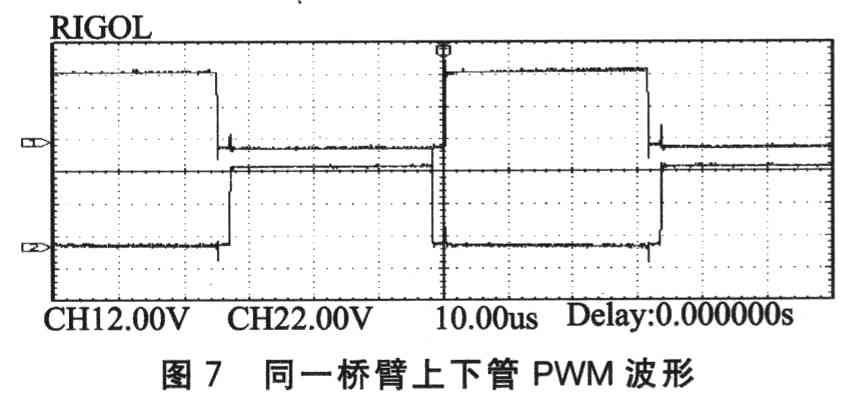图7为同一桥臂上下管PWMl与PWM2波形。由图可见,上下桥臂设置了2μs的死区时间,以保证逆变电路的安全工作。图8为DSP发出的PWM波形,(1)、(2)为两个互补的等幅不等宽的脉冲信号。其中高电平为+5 V,低电位为O V,脉冲宽度是按照正弦规律变化的。由于M57962L芯片采用的是负电位驱动,所以要采用电平转换电路。图9为最终驱动IGBT的SPWM波形(转换后的SPWM波形),从图中可以看出,波形的宽度是按照正弦规律变化的。图10(a)、(b)分别为f=200 Hz和f=300 Hz时的输出电压波形。实验结果表明,输出电压波形质量好,总谐波畸变率低。