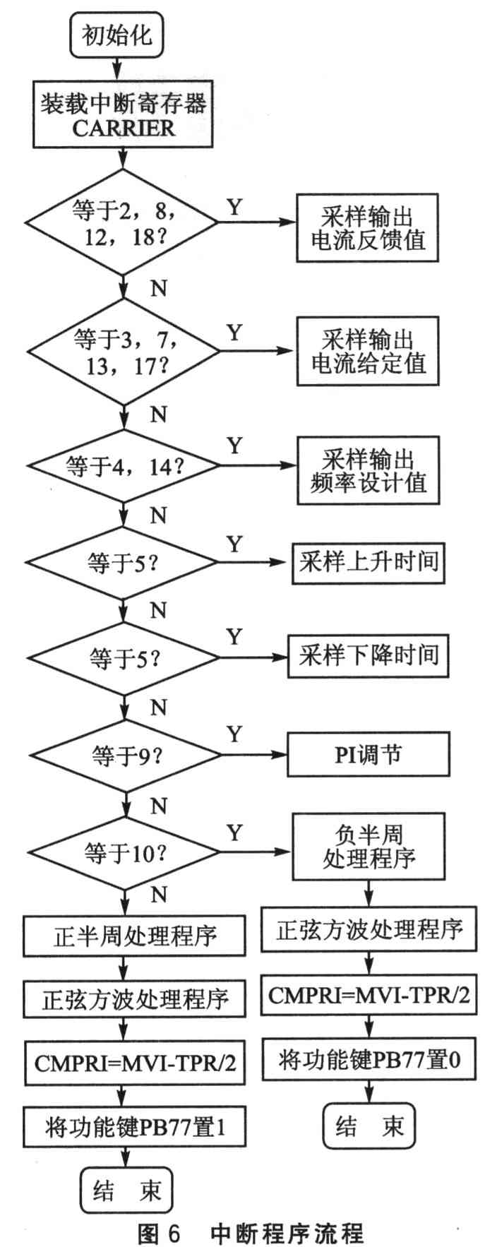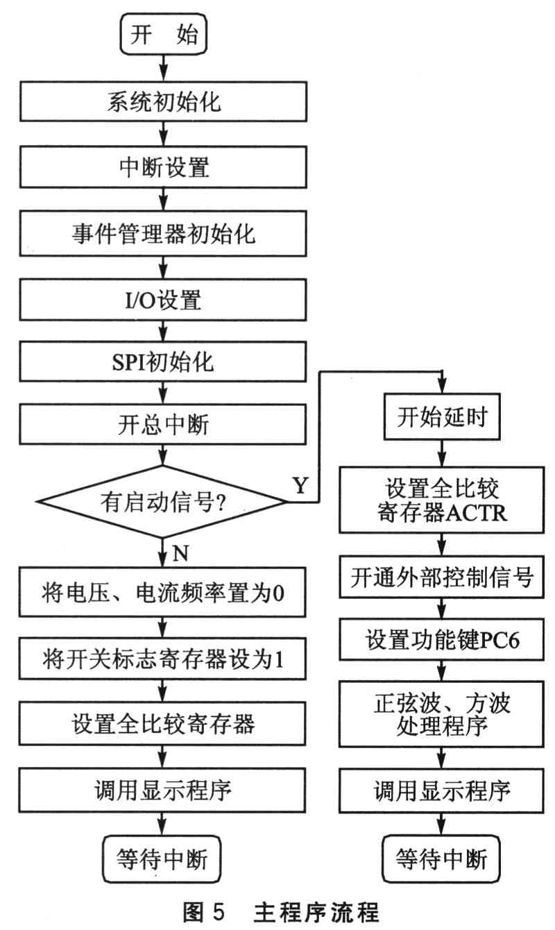 软件程序设计是逆变控制电路设计的核心。本系统软件主要包括:主程序、中断服务程序、PI调节程序、显示程序等。图5为主程序流程,图6为中断程序流程。在主程序中,完成DSP系统及外部设备初始化,I/O控制信号管理及正弦波信号产生和处理等。在中断程序中,完成电流、电压检测,PI调节计算,计算恒压频比下的调制度M和频率值,正弦波处理并给比较器CMPRl赋值等。
