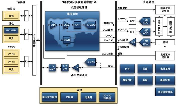 通过发射超声能量进入人体,接收并处理返回的反射信号,相控阵超声系统可以生成体内器官和结构的图像,映射血液流动和组织运动,同时提供高准确度的血流速度信息。传统设计中,构建这样的成像系统需要大量的高性能相控阵发射器和接收器,使得车载设备体积庞大且价格昂贵。近年来,随着集成工艺的进步,设计人员能够获得小尺寸、低成本而且高度便携的成像系统方案,并可达到接近大型成像设备的性能指标。而新的设计挑战依然存在,即在进一步提高方案集成度的同时提高系统性能和诊断能力。