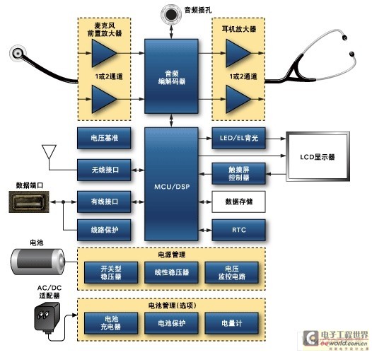 数字听诊器的主要单元是声传感器、音频编解码器和扬声器。声传感器将声音转换成模拟电压信号,这是信号链路的关键。它决定了数字听诊器的诊断质量,而确保用户获得与声学听诊器相同的体验。