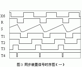 模块1的输入为X5、X6和来自模块3的四个脉冲T1、T2、T3、T4,虽然X5、X6都输入模块1,但是只有X6与此闭环有关,它们在模块1内经过一系列逻辑单元处理,输出为一系列脉冲,包括询问脉冲X(X=1,2,3,4)、寄存器询问脉冲、选择脉冲、输出自动微调脉冲和其它脉冲。模块2的输入R是矩形波信号,输出S类似于三角波。模块3的主体是四个电位器和四个电压比较器。四个电位器经过精心调节在滑动端形成四个等间隔的基准电压。四个电压比较器将S和这些基准电压分别进行比较,得到四个TTL电平脉冲信号T1、T2、T3、T4。T1、T2、T3、T4和S、R、X6时序关系如图3所示。