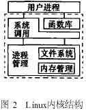 Linux内核有自己的结构体系,进程管理、内存管理和文件系统是其最基本的三个子系统。图2 为L inux 内核的结构。图中虚线框中部分可以看成是Linux内核的单内核结构,因此修改内核必须注意各子系统间的协调。