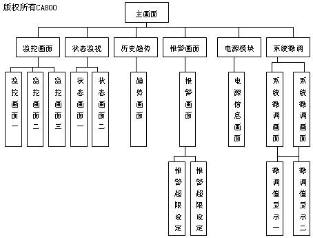 (1)系统功能设计:44个数字量采集显示,故障判断;6个电源模块的数据采集显示、显示电源模块的工作状态并判断报警;39路模拟量显示、并判断上下限报警;显示报警画面、报警信息、当前报警、报警频次;报警上下限设定;数据微调功能,并且显示微调值;