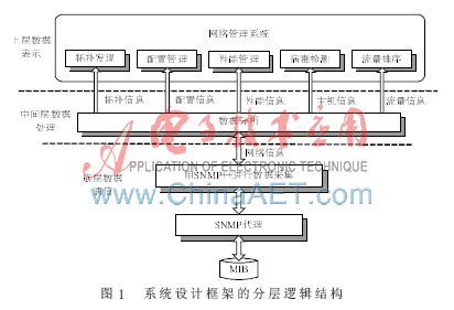 该系统分为三个部分如图1所示:底层数据通信、中间层数据处理与上层数据表示。底层数据通信部分负责实现管理者与被管设备之间的通信,获取代理设备中MIB库的有用信息,并把采集到的数据送往上层。中间层数据处理部分负责对采集到的网络信息进行处理,将相应的处理结果传给上层管理应用层进行显示。上层为数据表示层,对网络的配置管理、性能管理等功能模块以表格和可视化的图形界面显示,简洁直观。