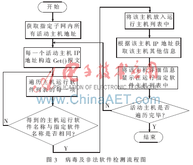 本系统中主机感染病毒或运行非法软件功能的实现是在拓扑发现结果的基础上,对管理员指定子网内的所有主机进行运行软件数据采集,将各主机中正在运行的软件名称和管理员指定的软件名称进行对比,最终排查出该子网内具体有哪些主机运行了指定的软件,并将排查结果存入相应的数据结构中,以直观图的形式显示出来。具体流程图如图3所示。