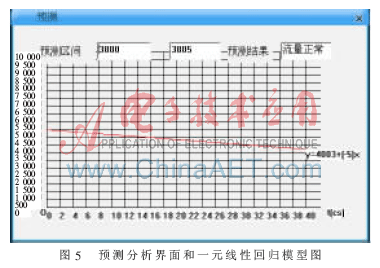 在流量采集分析的基础上运行系统性能预测功能,结果如图5所示。该部分流量预测模块是在图4接口流量采集分析基础上,利用了一元线性回归模型和区间预测算法,计算分析将来某一时刻接口的可能流量范围和流量发展趋势。本系统默认该预测分析算法的置信度为1-α=0.95,系统流量预测结果与运用数学工具计算分析结果相吻合,系统具有正确性。