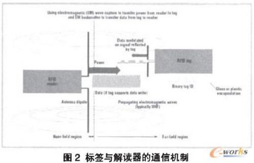 当标签与解读器之间的距离达到一定的阈值时,盘绕解读器的天线与盘绕标签的天线之间就会形成一个磁场。标签中包含的信息经过调制通过磁场以电磁波的形式发送给解凑器,解读器接收到相应电磁波后就进行解调,将电磁波转换为数据信息,即标签的EPC编码,如图2所示。