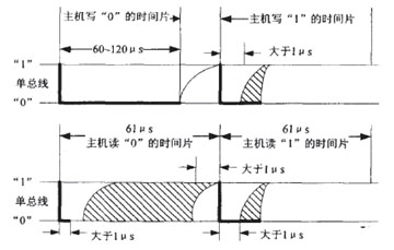(2) 写时间片:写一位二进制的信息,周期至少为61μS,其中含1μS的恢复时间,单片机启动写程序后15—60μs期间DS18B20自动采样数据线,低电平为“0”,高电平为“1”。单片机写“0”时,要持续低电平60—120μs,写“1”时,要在启动后15μs之内使数据线变为高电平。
