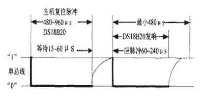 (1) 复位脉冲:单片机发出一个宽为480—960μs的负脉冲之后再发出5—60μs的正脉冲,此时DS18B20会发出一个60—240μs的响应脉冲,复位时序结束。也就是呼应阶段。