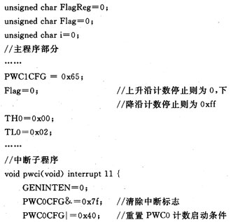 源程序中定义了3个变量,其中变量Flag存储原状态值;FlagReg存储当前采样值;变量i记录采样次数;改变i的值可控制滤除尖峰脉冲的等待时间。程序通过对原状态与当前采样状态异或之后的值来判断当前信号是有效信号还是干扰信号,从而对上升沿、下降沿的中间过度或尖峰脉冲干扰进行相应处理,退出中断子程序。实现了对正常信号计数、滤掉尖峰脉冲干扰的目的。