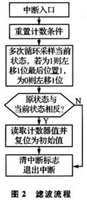 根据软件滤波设计思想,滤波子程序由主程序在信号状态发生变化,进入中断时调用,图2给出了滤波程序流程。对照图1中4种Section来分析流程图。当有边沿或干扰信号(信号周期大于计数时钟周期)到来时,VRS51L3074单片机的PWC计数停止条件满足,系统进入中断服务子程序。在中断子程序中,首先重置脉宽计数条件,然后对当前状态进行采样,采样1次,状态寄存器左移1位,采样到高电平记为“1”,采样到低电平记为“0”。如正常下降沿Section B,前面处于高电平段,初始状态变量Flag全为1,当出现低电平,控制器进人中断,紧接着进行16次采样。前已提及系统处理的尖峰干扰约1~2 ms,每个采样周期约为0.4 ms,其尖峰干扰脉宽达不到8个采样周期。系统设计时采样16次,只取最后8次的存储状态与原状态进行比较,如果最后采样的状态全为“0”则与原状态相反,就可判断出这是1个正常下降沿。如果是干扰信号引起计数中断,前面8个采样状态不全为“1”,后面8个状态全为“1”,最后采样的状态与原状态相同,就可判断出这是1个干扰信号,如Section A。在信号状态采样期间,计数条件满足PWC继续计数,直到真正的下降沿到来,计数停止并保存,计数寄存器还原为初始值,这样干扰信号即被滤除。类似地,正常上升沿Section D,存储器原状态为“0”,上升沿来临后存储器状态为“1”,与原状态相反,PWC计数停止并保存,计数寄存器还原为初始值,退出中断子程序。有干扰信号出现后采样状态与原状态相同,干扰尖峰脉冲可被滤除。如果要使脉宽计数更精确,可判断前8个采样周期中系统不正常计数的周期,然后与最终计数周期相加即可。此时,程序流程体现出软件滤波功能。