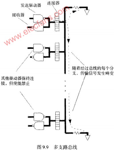 多支路情况下就有很大不同,在如图9.9所示的多支路总线中,连接在总线上的发送器每次只有一个使能,而其他发送器则保持使能禁止,但其还是连接在总线上,直至办轮到其发送,这种特殊类型的总线两端都进行了端接,以防止反射,总线上传播的信号的上升时间只是线路总长度的一小部分。