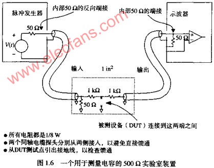 在很多高速接收器的技术规范文档中,生产商说明了其电容参数。但是,如果没有技术规范文档,可以采用图1.6所示的电路测量其中一个样品。测量时,调整脉冲发生器产生一个脉冲,使其电压大小处于接收器有效范围的中间,而且幅值和实际应用条件下的幅值相差不多。给接收器上电。一般典型的电容值为2~10PF。