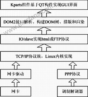 Konqueror/embedded是由底层网络连接,图形化用户界面和处理HTML绘制的引擎KHTML构成的。底层的通信协议实现是基于KIO/slave机制来实现的;GUI" title="GUI">GUI界面采用Kparts组建技术和Qt的基本构件;而作为Konqueror/embedded的核心,KHTML则运用了文档对象模型(DOM)所提供的API接口,并在DOM树上挂接javascript引擎,CSS解析器以及渲染引擎。Konqueror/embedded的层次结构如图1所示。