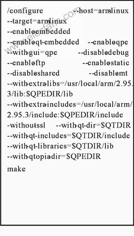 将Qt/X11编译完毕而生成的uic拷贝到Qt/E的bin目录下面。在编译Qt/E之前,先要将Qtopia的一个配置文件拷贝到Qt/E中,表示Qt/E的配置是按照Qtopia要求的,即:cp Qtopia-free-1.7.0/src/Qt/qconfig-qpe.h Qt-embedded-2.3.7/src/tools/