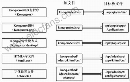 在Konqueror/embedded编译完成之后,目录下会生成相应的可执行文件。因此Konqueror/embedded的安装主要是指将可执行文件和一些其他的配置文件拷贝到嵌入式系统的文件系统中去。一般来说,Konqueror/embedded运行需要5个文件,图3描绘了这5个文件的原来所在路径和安装到目标板的路径,这些都要手动去拷贝。