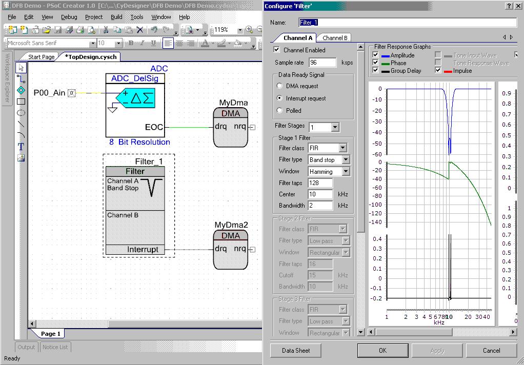 数字滤波器块可通过几种方式使用。PSoC Creator 中集成的滤波器设计工具支持拖放工作方式,将数字滤波包括到信号流程中来。启动时 PSoC Creator 配套提供了专用的 FIR 滤波器“组件”,在系统中可以像其他块一样使用。该组件能对信号应用多种不同滤波器,既能单独使用,也能组合使用。图 1 显示了该组件的屏幕截图,从中我们看出它在 PSoC Creator 项目中的使用情况以及设置属性的配置窗口。今后,更多滤波器拓扑和互动滤波器设计向导还将添加到 PSoC Creator中。