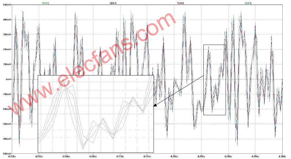 图 3 显示了内插滤波器系统的四个输出,我们看到底层带限波形在形状和计时方面都已经得到了准确重构。这种方法使单个高品质 ADC 能满足极高的计量准确性要求,支持各种相关功率因数和谐波频率要求。这种方法对其他需要高效同时采样的应用而言同样适用。