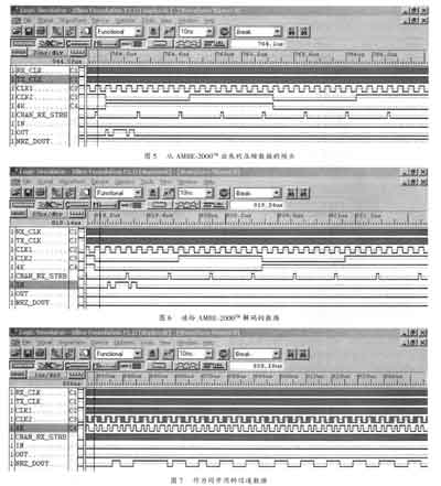 图5是从AMBE-2000TM出来的压缩数据的帧头,192位帧头只仿真了前面的16位,以后的全设为"0"。图6是送给AMBE-2000TM解码的数据(只显示了帧头)。图7是去掉帧头只加上系统帧头Oxl3EC作为同步用的信道数据,为了方便,仿真时将有效数据设定为"1001......"(一帧有效数据共40bit)。传输率为4kb/s.