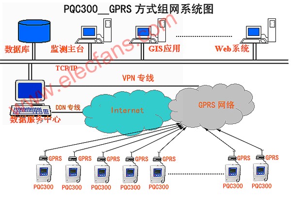 PQC300__GPRS方式组网系统采用GPRS数据通信通道,在PQC300监控终端、GPRS基站、GPRS交换机房、供电公司之间建立一个虚拟专网(VPN),为保证通道的稳定、可靠,在移动机房与电力公司机房直接敷设光缆联接,所有数据经过加密传输,确保任何数据不受非法侵入修改,且前期投入及日常维护费用少。