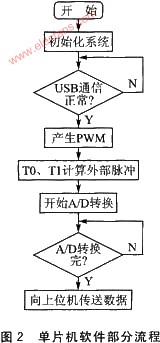 单片机的软件部分主要完成光栅位移传感器的数据采集、A/D转换、计算光栅位移传感器的正向、反向莫尔条纹的个数、为数字电路提供CP脉冲以及完成USB的通信等工作。图2是单片机软件部分的流程图。