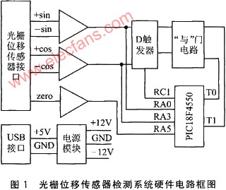 图1是一个光栅位移传感器检测系统硬件电路框图,主要实现数据的采集、处理、传输和PWM脉冲的产生等。从光栅传感器输入的信号有5路:±sin,±cos以及零窗信号zero。经差分放大电路合成,分3路进入PIC单片机模拟量输入口进行A/D转换;同时,经差分放大电路合成后的sin、cos信号经过零比较器后转换成数字脉冲信号,然后经D触发器和“与”门电路完成光栅位移的辨向。PIC单片机T0和T1口接收来自“与”门电路的数字脉冲,完成光栅位移的计数(计算光栅尺移动的完整光栅数);PIC单片机RC1口输出4 MHz的PWM脉冲信号作为D触发器的CP信号。计算机的USB接口两根数据线分别接PIC18F4550的D+和D-口,用于完成计算机和单片机之间的数据通信。计算机的USB电源一方面为PIC微处理器提供能源,另一方面通过电源模块转换成±12 V电源,为运放电路提供正负电源。