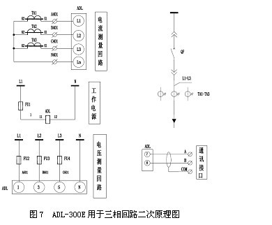 用于三相回路的二次原理见图7,ADL-300E支持0.05A电流信号接入,电流互感器二次侧不允许接地。