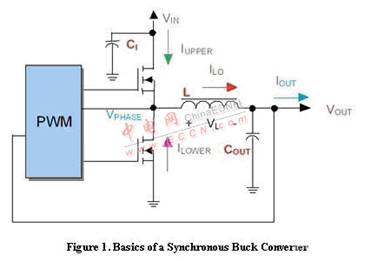 图1显示了一种降压开关稳压器的基本原理,即同步降压转换器。“同步降压”指的是MOSFET用作低边开关。相对应的,标准降压稳压器要使用一个肖特基二极管做为低边开关。与标准降压稳压器相比,同步降压稳压器的主要好处是效率更高,因为MOSFET的电压降比二极管的电压降要低。低边和高边MOSFET的定时信息是由脉宽调制(PWM)控制器提供的。控制器的输入是来自输出端反馈回来的电压。这个闭环控制使降压转换器能够根据负载的变化调节输出。PWM模块的输出是一个用来升高或降低开关频率的数字信号。该信号驱动一对MOSFET。信号的占空比决定了输入直接连到输出的导通时间的百分比。因此,输出电压是输入电压和占空比的乘积。