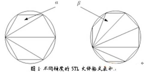 CAD模型的STL格式转换即是用三角形面片逼近实际模型表面,转换为所谓的事实上的标准文件格式。STL文件的精度等级不同,所产生的转换误差也不同。STL文件的精度是指用STL格式拟合最大允许误差。实际上,如果原几何模型完全由直边组成,则STL格式拟合绝对准确,没有任何误差;否则,存在拟合误差。例如同一个圆分别使用4个及6个三角形的STL格式表示,如图1所示。